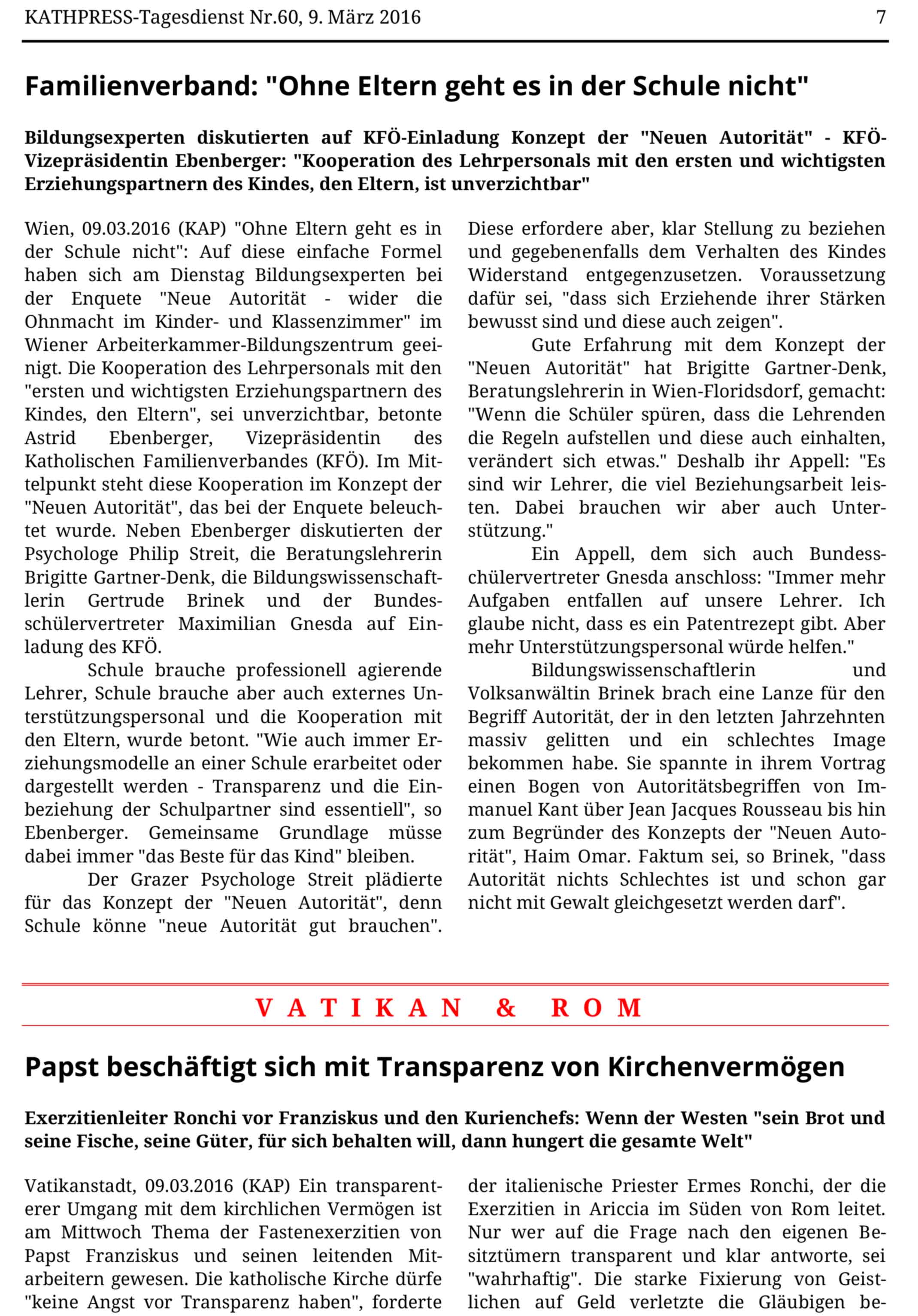 Für die Unterstützungsbrücke plädiert auch Astrid Ebenberger, Vizepräsidentin des Katholischen Familienverbandes und als Lehrende an der Kirchlich-Pädagogischen Hochschule Wien/Krems, auch Expertin im Bereich Lehrer/innenausbildung: „Schule braucht professionell agierende Lehrerinnen und Lehrer. Schule braucht aber auch externes Unterstützungspersonal.“ Unverzichtbar sei aber die Kooperation mit den ersten und wichtigsten Erziehungspartnern des Kindes, den Eltern, ist Ebenberger überzeugt., „Wie auch immer Erziehungsmodelle an einer Schule erarbeitet oder dargestellt werden – Transparenz und die Einbeziehung der Schulpartner sind essentiell“, so Ebenberger.