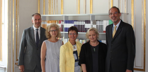 v.l.n.r. Familienverbandspräsident Alfred Trendl, Schularbeitskreismitglied Andrea Kahl, Vizepräsidentin Astrid Ebenberger, Bildungsreferentin Sissy Löffler, Bildungsminister Heinz Faßmann.