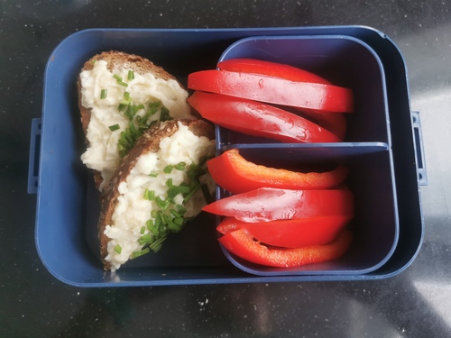 Jausenbox 2: Schwarzbrot mit Kartoffelkäse und Paprika